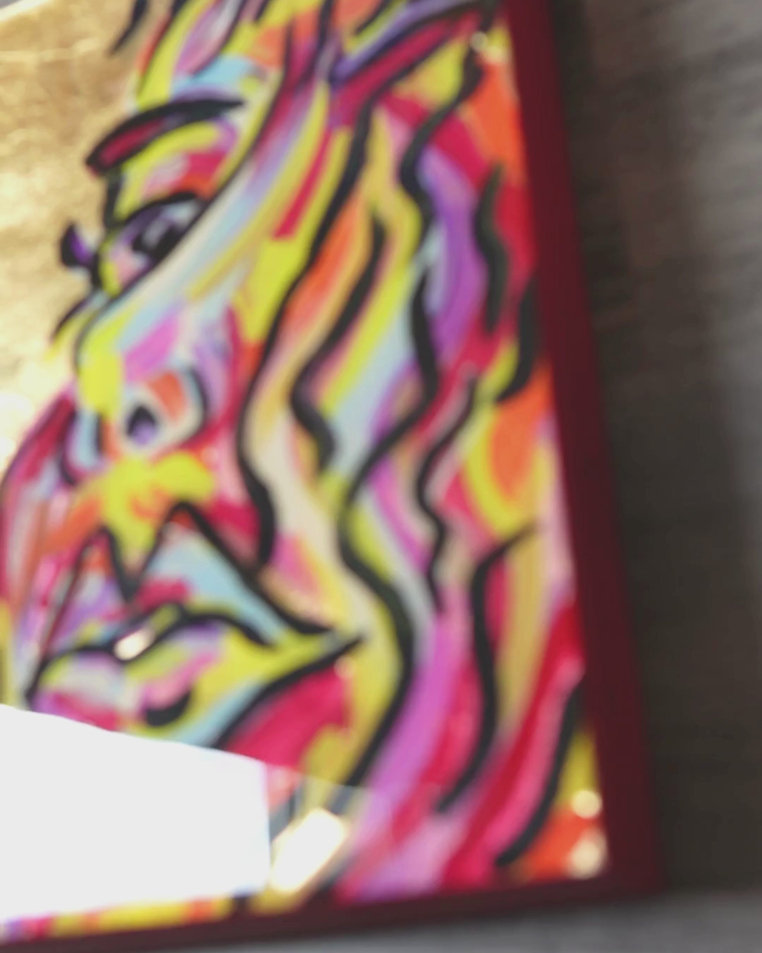 This striking painting features a woman’s face set against a luxurious gold background, radiating elegance and strength. Her features are brought to life with vivid, colorful brushstrokes, blending hues of deep blues, vibrant reds, and soft purples, which swirl around her in dynamic motion. The wind seems to dance through the painting, with hair and colors flowing wildly, creating a sense of movement and energy. The golden backdrop contrasts beautifully with the expressive colors, highlighting the woman’s poised yet powerful presence. This piece captures the essence of both grace and chaos, evoking feelings of freedom, transformation, and inner strength.